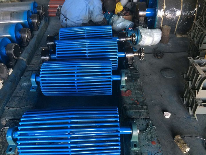 鼓型排渣滾筒系列兩端設置倒錐體結構,接觸面采用輪幅式,便于物料特別是大塊物料的排除,在輪幅工作面通過特殊工藝包覆聚氨酯彈性體耐磨材料,以利于提高耐磨性能及清掃效果,完全保護滾筒和膠帶,接觸面采用鼓型結構,可起到糾偏作用。